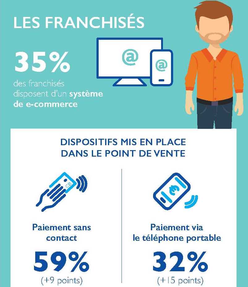 Quant aux franchisés, ils sont 35 % à disposer d’un système de vente en ligne, dont 71 % réalisent leurs ventes via le site marchand du franchiseur. Un important développement est également observable du côté de la vente par application sur mobile, le m-commerce. 45 % des enseignes investissent désormais sur ce canal de distribution (+ 11 points).