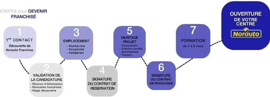 Le pionnier du concept de centre auto, Norauto, a été créé en 1970. Il est le leader national de son secteur. L’enseigne consacre au développement de son réseau plus de 30 personnes exclusivement dédiées à cette tâche. Les candidats désireux d’adhérer au réseau devront passer par un certain nombre d’étapes prédéfinies.