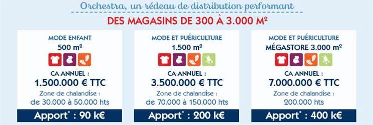 Les plus petits points de vente du réseau Orchestra ont une surface moyenne de 500 m². Ils requièrent un apport personnel de 90 k€ et engendrent un CA annuel de 1 500 000 € TTC. Sa zone de chalandise s’étend de 30 000 à 50 000 habitants.