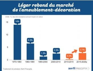 Les experts de XERFI-PRECEPTA restent toutefois septiques en estimant à 2,7% la hausse en valeur par an d’ici à 2020 sur un marché de 30 milliards d’euros, répartis à parts égales entre les meubles et la décoration.