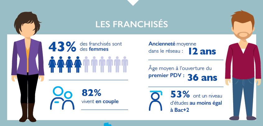 Ils ont en moyenne 12 ans d’ancienneté dans le réseau et ont ouvert leur premier point de vente à l’âge moyen de 36 ans. Un franchisé sur deux a un niveau d’études au moins égal à Bac + 2.