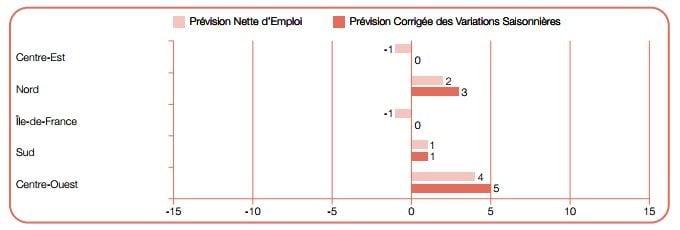 - Enfin, pour ce qui est de la région Centre-Est, le ralentissement des perspectives d’embauches se confirme pour le troisième trimestre consécutif.