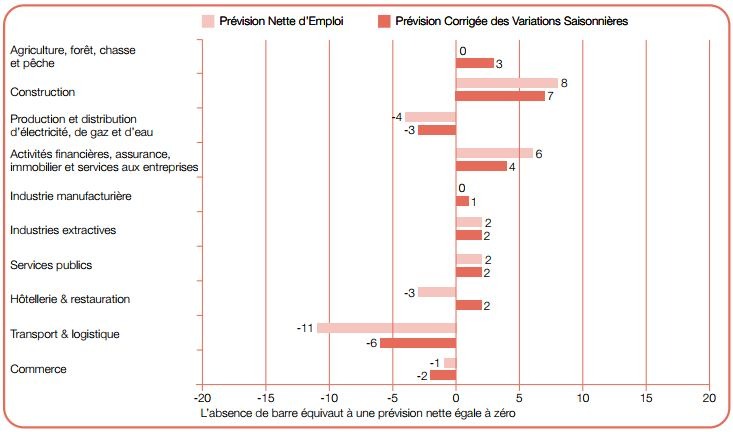 - Le secteur de la Construction revient en force et affiche + 8 points par rapport au précédent trimestre avec des perspectives d’embauche encourageantes : + 7 %.
