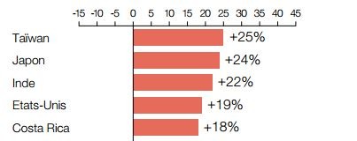 Par ailleurs, le rythme d’embauches le plus soutenu se trouvera à Taïwan, au Japon, en Inde et au Costa Rica. Les États-Unis se classent eux aussi dans le Top 5 (+ 19%), juste devant le Costa-Rica, affichant les perspectives d’embauche les plus optimistes depuis 2007.