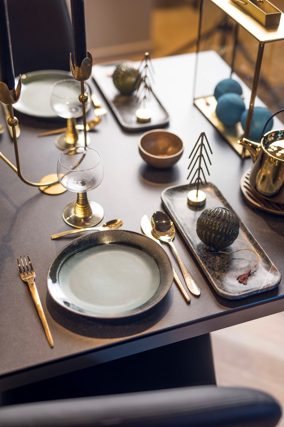 Mobalpa a également imaginé une ambiance nuit étoilée, où règne un bleu profond. Tons sombres en écho aux façades Fenix Blu Fès de la cuisine, sapins en métal, vaisselle aux teintes lacustres, verres aux pieds couleur mousse, grappes de boules de Noël dans un camaïeu bleu marine…