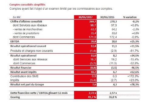 Compte tenu de la contribution des Sociétés Mises en Equivalence pour 0,8 M€ et d’une charge d’impôt de 3,4 M€, le résultat net consolidé du premier semestre 2017 s’élève à 7,6 M€, en progression de 3,4 M€ par rapport au premier semestre 2016.