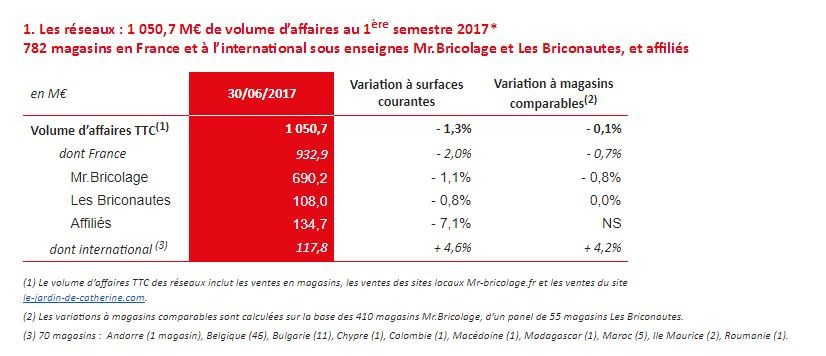 Christophe Mistou, Directeur général de Mr.Bricolage SA. s’est félicité du succès de la 1ère étape du plan stratégique Rebond. Cette nouvelle stratégie a permis au groupe de redimensionner son parc de magasins intégrés, d’opérer une refonte de son offre et de remettre à plat ses achats et ses systèmes d’information. Sur un marché français des Grandes Surfaces de Bricolage (GSB) en repli de 0,6% à magasins comparables à l’issue du premier semestre 2017, les magasins Les Briconautes surperforment avec une activité stable tandis que les réseaux sous enseigne Mr.Bricolage cèdent 0,8% à magasins comparables. Au 30 juin 2017, le volume d’affaires total des 712 magasins ouverts en France s’élève à 932,9 M€.