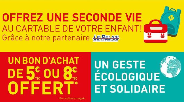 Le réseau Hyperburo s’est engagé avec Le Relais pour reprendre les anciens cartables et leur donner une seconde vie. La campagne de récupération a eu lieu du 26 juin au 14 juillet et faisait bénéficier les clients du réseau Hyperburo participants à l’opération de bons d’achat de 5 € ou 8 €.