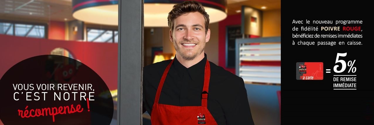 La carte de fidélité: Poivre Rouge met également à la disposition de ses clients sa carte de fidélité permettant de bénéficier de 5 % de réduction immédiate sur son addition, à chaque visite et de profiter d’offres exclusives et d’un bonus en renseignant toutes ses informations personnelles. L’offre bonus consiste en une grillade de viande offerte pour une grillade de viande achetée.