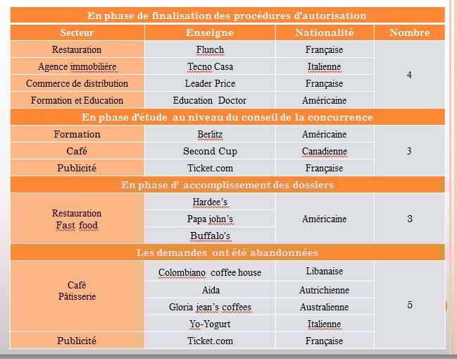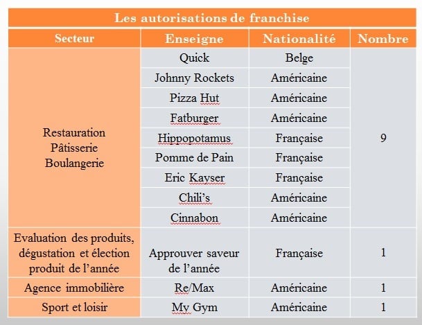Alors que les enseignes nationales, quel que soit le secteur d’activité, peuvent franchiser d’office, les enseignes étrangères, si elles ne font pas partie de l’un des 26 secteurs libres pour les franchises étrangères, doivent déposer une demande préalable d’autorisation auprès du ministère du commerce qui statue après avoir reçu l’avis du conseil de la concurrence.