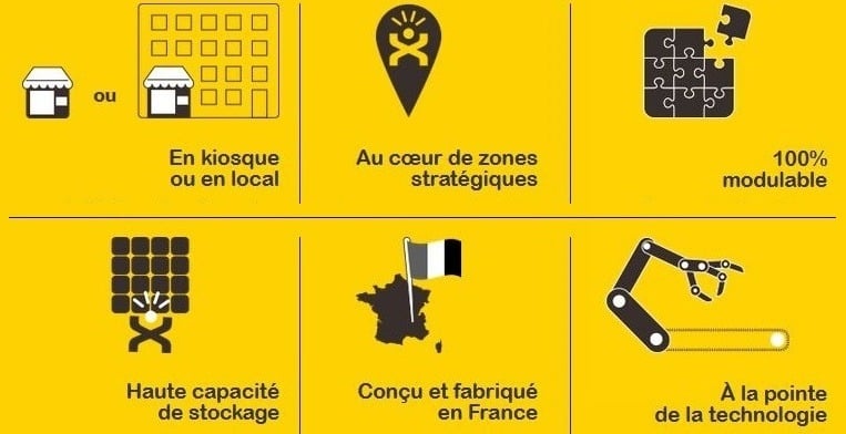 - Ont une haute capacité de stockage: peut proposer jusqu’à 1 600 références et répondre à tous les besoins de consommation courante en produits secs ou frais: épicerie, alimentaire, snacking, bricolage, droguerie, parapharmacie, hygiène, accessoires high-tech.
