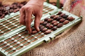La gérante du point de vente Yves Thuriès de Montpellier a pu côtoyer les récoltants locaux. Ces derniers ont accompagné les visiteurs dans les plantations lors de la découpe des cabosses. Une fois recueillie, la cabosse est fendue selon la technique de l’écabossage. Coupée en certains points, la cabosse ainsi ouverte permet le déveinage. Cette opération réalisée manuellement consiste à séparer la fève de son enveloppe blanche : le mucilage.