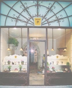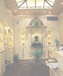 La pierre, la terre cuite, le fer forgé sont associés à la délicatesse des bijoux, au milieu d’une ambiance naturelle suggérée par une fontaine, une verrière et une multitude de plantes.