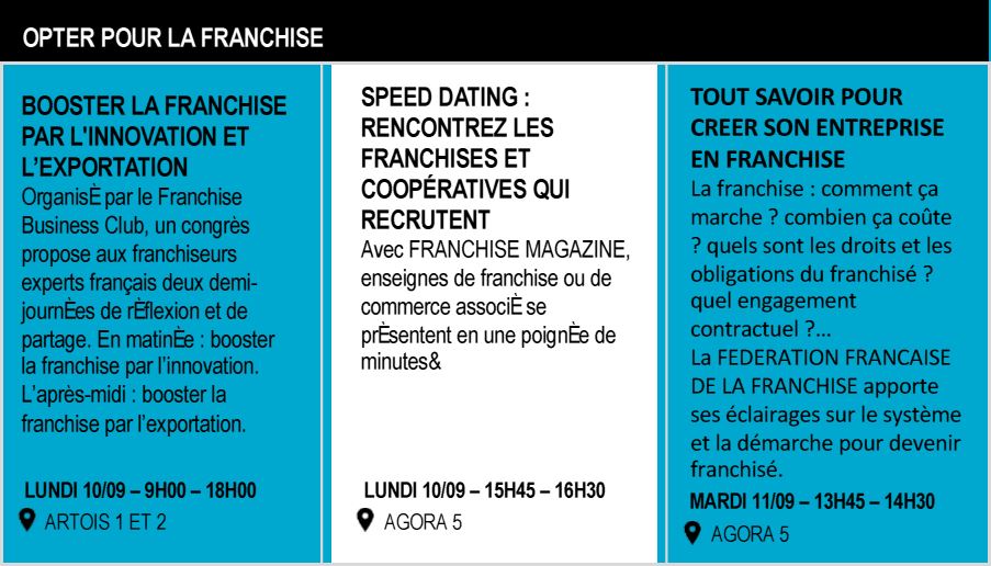 – le lundi 11 réfléchir à l’innovation digitale en franchise le matin et réfléchir à la manière de batir une stratégie export l’après-midi