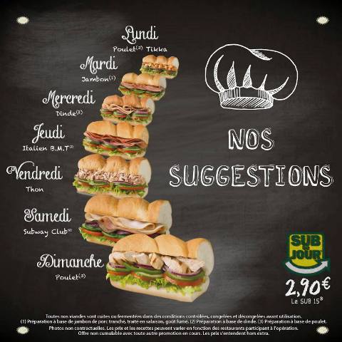 Afin de répondre aux exigences et au goûts variés de sa clientèle, le réseau Subway propose une offre très variée de sandwichs et des produits frais pour leur permettre de composer eux mêmes leurs menus. A côté des produits permanents, des produits additionnels sont ajoutés pour correspondre aux saisons, aux fêtes, aux animations ce qui renouvelle constamment l’intérêt des clients.